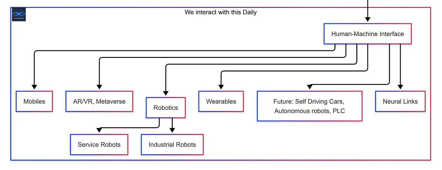 This pillar focuses on how humans and machines work together - from industrial robotics to neural interfaces to your mobiles to whats is possible future. It’s about extending human capabilities rather than replacing them, creating hybrid systems that combine human judgment with machine precision.