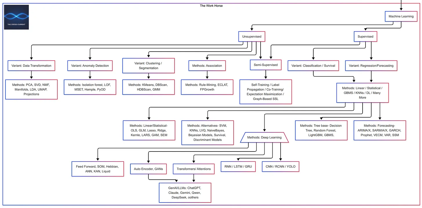 Machine learning drives most real business value in AI today. It focuses on finding patterns in data to predict outcomes, classify information, or spot trends that humans might miss. Unlike the flashy GenAI tools, ML quietly runs recommendation engines, fraud detection systems, and supply chain optimization across industries. here is a non-exhaustive view of Machine Learning (ML)