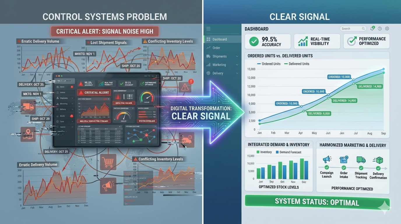 The organization was attempting to solve a Control Systems problem (lag) with a Regression tool. Previous models failed because they trained on “Delivery Date”—a lagging indicator polluted by operational friction. This created a mathematically inevitable phase shift: the business was forecasting based on what happened 10 days ago, not what the customer intended today.